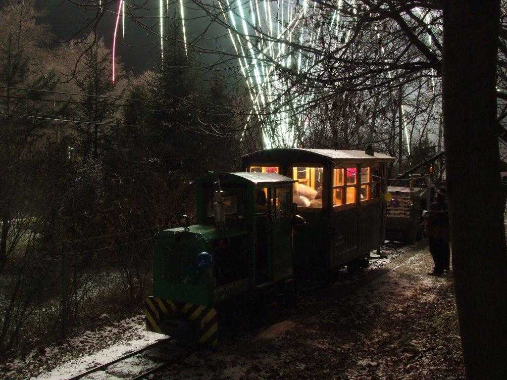 Két vonatunk is a pályán köszöntötte az Újévet. A második vonat, a P-2-es mozdonnyal, két nyitott kocsiva jött, utasokkal tele. A hidegre (-10°C) senki sem panaszkodott. A Kőrózsánál rendezett tüzijáték pedig igazán szép volt. Fotó: Kovalcsik Tamás (2009.01.01.)